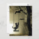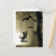 Black cat in a spooky evening tree swing plays with the swarming bats and invites you to join in Halloween postcard