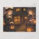 Capture the eerie charm of Halloween with this beautifully illustrated card featuring two young witch sisters standing in front of a glowing haunted house under a full moon. With their carved jack-o'-lanterns and detailed Victorian-style dresses, this enchanting scene transports you to a nostalgic Halloween night filled with mystery and magic.