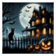 A scary house with full moon, cat, pumpkins and bats