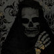 This Grim Reaper is ready for Halloween selfies. Personalize the header with the name of your castle, estate, manor or asylum. Great for Photobooth selfies or Instagram posts, in person parties or remote parties or Zoom parties. Black Damask wallpaper for the "House of Usher" feel.