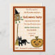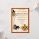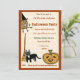This cute quirky halloween party invitation features illustrations of a broom, an owl dressed for halloween , a lucky black cat, a smiling pumpkin and a leaning witch's broom. The design is in light orange and brown, giving a festive fall feel to your fun fancy dress halloween party. The fall colors and barn-like arrangement of the images are suited to any family hallowe'en gathering- cute and folksy.