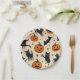 A festive Halloween paper plate featuring a cute pumpkin and cat pattern, ideal for serving treats at Halloween parties and gatherings.