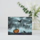 Vibrant Halloween design featering a glowing pumpkin with bright eyes and teeth in a dark landscape with trees and ravens.