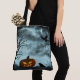 Vibrant Halloween design featering a glowing pumpkin with bright eyes and teeth in a dark landscape with trees and ravens.