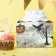 Vibrant Halloween design featering a glowing pumpkin with bright eyes and teeth in a dark landscape with trees and ravens.