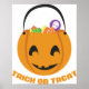 Adorable Halloween style pumpkin bucket is filled with tasty candy. Text reads, Trick Or Treat.