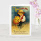Vintage Halloween greeting card illustration showing a Victorian child carving a jack o' lantern with text "It's Halloween when little boys are frightened by the slightest noise, and little girls run off to bed and climb in quick, and hide their head."