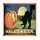 Pumpkin being scared by the black cat while the moon looks on.