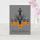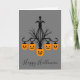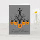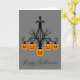 Gothic design of a black chandelier with carved pumpkins. Stylish gothic halloween design with a black and orange theme. Happy Halloween