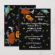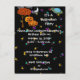 Halloween Invitation Featuring a Black Sky, Crescent Moon, Colorful Saturn, Clouds and more colorful stars abound. Cute Pumpkin Family standing next to a tree with orange fall color Leaves and a Big BOO! With eyes atop the letters all inviting you to a most but not too spooky Halloween Harvest Party. Perfect for the Church Harvest Halloween Party too!