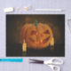 Happy Halloween illustration featuring a pumpkin illuminated by candles on a dark background.