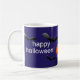 Happy Halloween mug with pumpkin and cool black cat, witch flying on broomstick in the moon, and cool bats