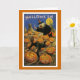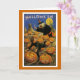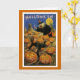 Vintage Halloween greeting card illustration showing a trick or treater being frightened by a witch in a jack o'lantern pumpkin patch.