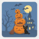 Cute black cat and a witch broom near a stack of laughing pumpkins that are falling over. A dead tree, a creepy mansion, some bats, and the moon are seen on the background.