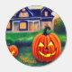Candlelight Halloween pumpkins in front of a house