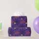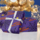 This adorable wrapping paper for Halloween has spider webs and spiders on a purple background. Orange Happy Halloween text.