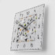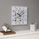 This graphic design is for the Halloween season. It is a random iconic pattern with printed silver-gray texture background. The iconic shapes are witches, ghosts, bats, haunted houses, and more. The square clock face has numbers for the hours and minutes.