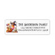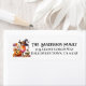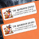 Welcome guests to an annual Halloween costume party, Halloween baby shower, or any event with this fun and simple return address label. A simple overall black and white look that has a mix of simple and script typography. A black haunted house with orange pops of color from orange pumpkins and jack-lanterns. Some cute little ghosts and bats just round out this fun look. Spooky Black Orange Haunted House Bats Ghost Happy Halloween Party return address label