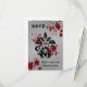 RSVP cards for a theme Halloween, Vampire, or Gothic wedding. These feature an elegant Victorian damask motif in black with blood splatters on a light grungy gray background. Add 2 names to the front. The text on the back can be changed, or left as is.