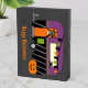 Fun Halloween graphic features retro style rv trailer in seasonal colors with pumpkin, spiderweb and bunting flags over the window, on charcoal gray background with orange "Happy Halloween" customizable text overlay.