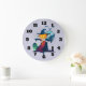 A clock with a cool halloween illustration. Set on a gray lavender background. A large scarecrow with a pumpkin head, wearing a witches hat. He has a menacing grin wearing tattered robes and is standing in a graveyard with a crow screeching on his arm. Bats flying off in the distance, a full moon in the background and a lone owl with glowing eyes sits on a tombstone.