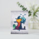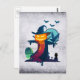 A postcard with a cool halloween illustration. Set on a gray grunge background. A large scarecrow with a pumpkin head, wearing a witches hat. He has a menacing grin wearing tattered robes and is standing in a graveyard with a crow screeching on his arm. Bats flying off in the distance, a full moon in the background and a lone owl with glowing eyes sits on a tombstone.