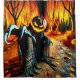 This shower curtain has a scary pumpkin man on it.