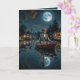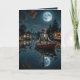 A skeleton wearing a red baseball cap sits in a small boat on a tranquil moonlit canal, with cozy cabins lining the shore