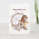 Skeleton wearing a witch's cap with lantern, spider web, and flower.
