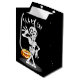 Funny Halloween skeleton with a flaming pumpkin on black background.