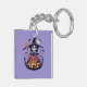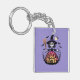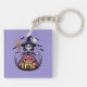 This Halloween Skeleton Witch Square Keychain showcases a charming skeleton witch with a broom and pumpkin dress under the moonlight, surrounded by bats on a purple background. A perfect Halloween accessory to add a touch of spooky cuteness to your keys or bag.
