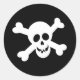 A black and white happy skull and cross bones sticker. A sheet of 6 large stickers is perfect for decorating your Halloween greeting card envelops, but the stickers can also be printed in a smaller size.