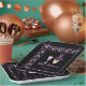 A fun Halloween design that features a skull with a top hat and plenty of potions. The bottom has a border of glasses and a bottles inside two ruled lines. The text can be customized.