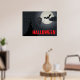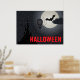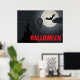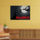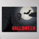 A Halloween poster showing a spider in a spiderweb, a spooky castle with bats flying around it and a full bright moon in the background. The word Halloween is written down in deep red letters. Happy Halloween!