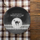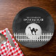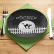 Halloween spooky scary black cat, full moon moonlight fence, black and white, Halloween party paper plate, kitty kitten Halloween spooky, minimalist simple whimsical typography, Halloween creepy black fog, black cat silhouette picket fence, Halloween party supplies, Halloween Spooktacular paper plate