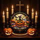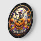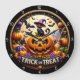 This image features a round wall clock with a festive Halloween theme. The clock face is adorned with various spooky but friendly characters and elements. A prominent carved pumpkin with a smiling face is at the bottom center. Perched on top of the pumpkin is a black cat wearing a purple witch's hat. Surrounding these main figures are bats flying under a crescent moon, a friendly white ghost, a witch's broom, and numerous pumpkins and colorful flowers in shades of orange, purple, and green. The phrase "TRICK or TREAT" is displayed prominently on a banner at the bottom. The clock has a black frame with white numbers from 1 to 12.