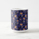Halloween themed mug with witches hats, pumpkins, crows, bats and a moon on a purple background.