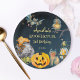 Halloween spooky spooktacular birthday party tableware personalized template plates, Halloween pumpkin, bat, owl, cat, brewing pot starry night sky black background.