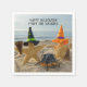 Halloween starfish witches with hats and brooms in beach sand with black pot on burning logs