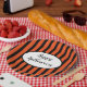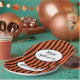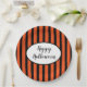 This Halloween paper plate is shown with a festive black and orange stripes design.