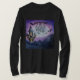Halloween Tee shown in black with long sleeves and witches words on a purple and blue background with bats and an old cranky house. Thanks to Creative Fabrica for some of the elements in the design.