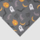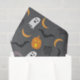 Halloween theme - black and orange seamless repeating pattern with orange "s, bedsheet ghosts, witches hats, black bats and cauldrons.