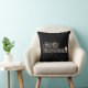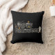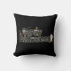 This throw pillow is shown in a black and orange colors with a festive Happy Halloween ghost and bats print design.