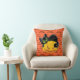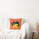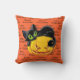 This throw pillow is shown in a black and orange color with a cute Happy Halloween black cat print design.