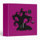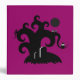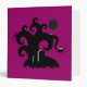 Silhouette of a whimsical tree with big-eyed owls sitting on the curly branches with a couple of gravestones visible below. A black silhouetted moon can be seen in the distance.