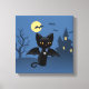 Cute cartoon black cat with bat-like wings. A dead tree, a creepy mansion, some bats, and the moon are seen on the background.