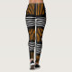 These leggings have a mid-century modern design that looks like a weave with orange and white lines on a field of black.
