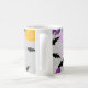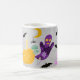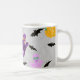 This whimsical coffee mug features non-traditional Halloween colors and ghosts, spiderwebs, mushrooms, bats, and flowers.