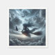 A witch rides a broomstick through a stormy night sky accompanied by a black cat and surrounded by swirling clouds and lightning