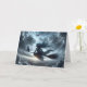 A witch rides a broomstick through a stormy night sky accompanied by a black cat and surrounded by swirling clouds and lightning